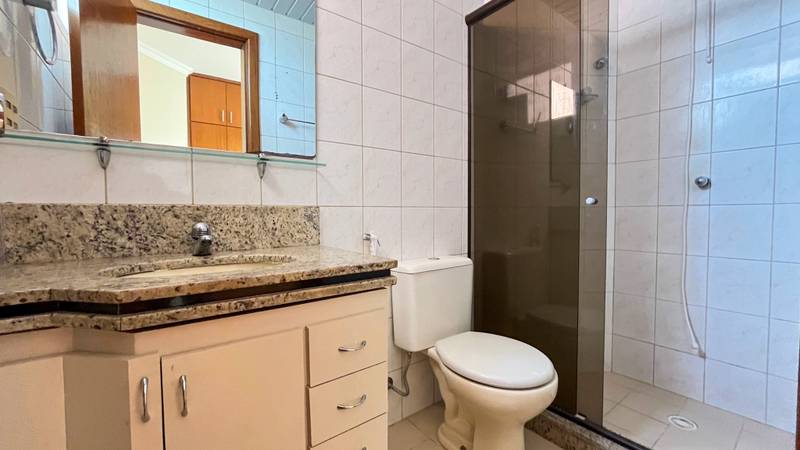 • Banheiro social com bancada em granito, armários planejados e box em blindex.