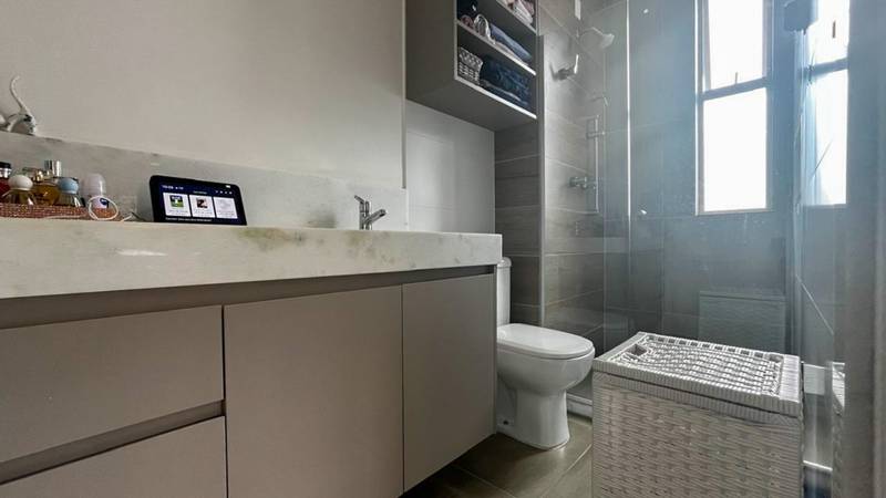 • 3 quartos com armários planejados, iluminação personalizada e piso laminado de madeira, sendo 2 suítes com armários, bancadas em mármore, piso em porcelanato e box blindex.