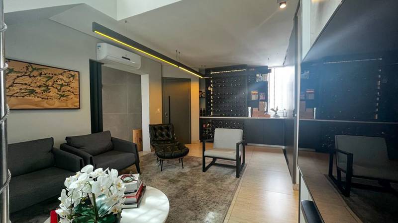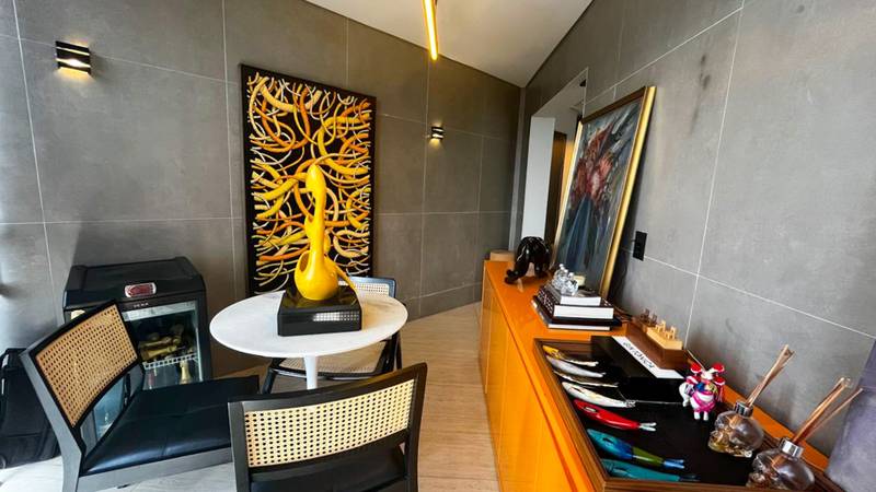 • Sala de estar integrada a uma elegante adega climatizada com iluminação personalizada;