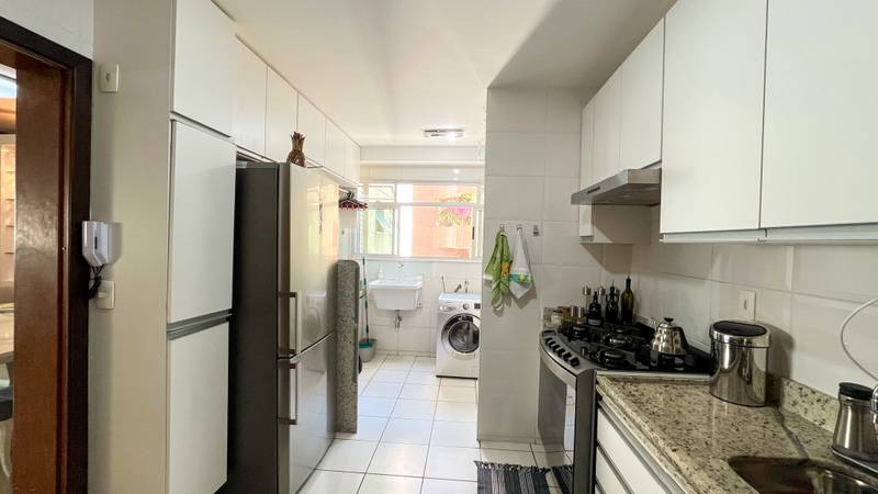 • Cozinha funcional com armários, bancada em granito, piso em cerâmica e coifa.